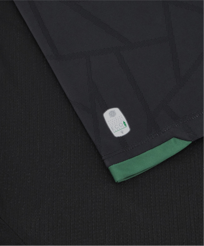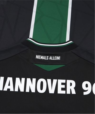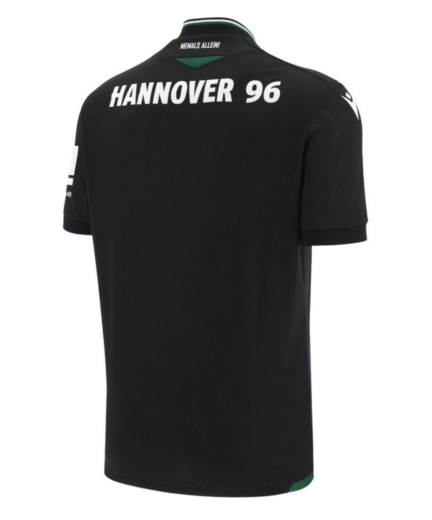 Het Hannover 96 uitshirt heeft daarnaast een verfijnd ruitenpatroon over het voorste deel, wat het shirt extra karakter en diepte geeft. Alle logo’s zijn centraal geplaatst, met het Macron-logo boven het clublogo en het Heise-logo dat de verticale baan op een stijlvolle manier onderbreekt. De Koreaanse kraag is uitgevoerd in de traditionele clubkleuren zwart, groen en wit, waardoor het ontwerp volledig aansluit bij de identiteit van Hannover 96. Aan de binnenkant van de hals zit een label met het clublogo en het motto van de club: ‘’NIEMALS ALLEIN!’’, dat ook op de achterzijde van de hals zichtbaar is.