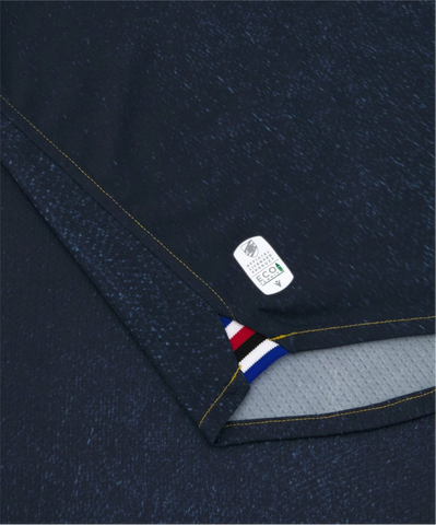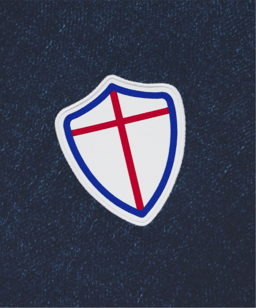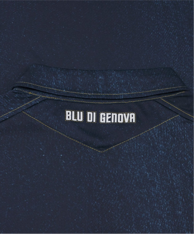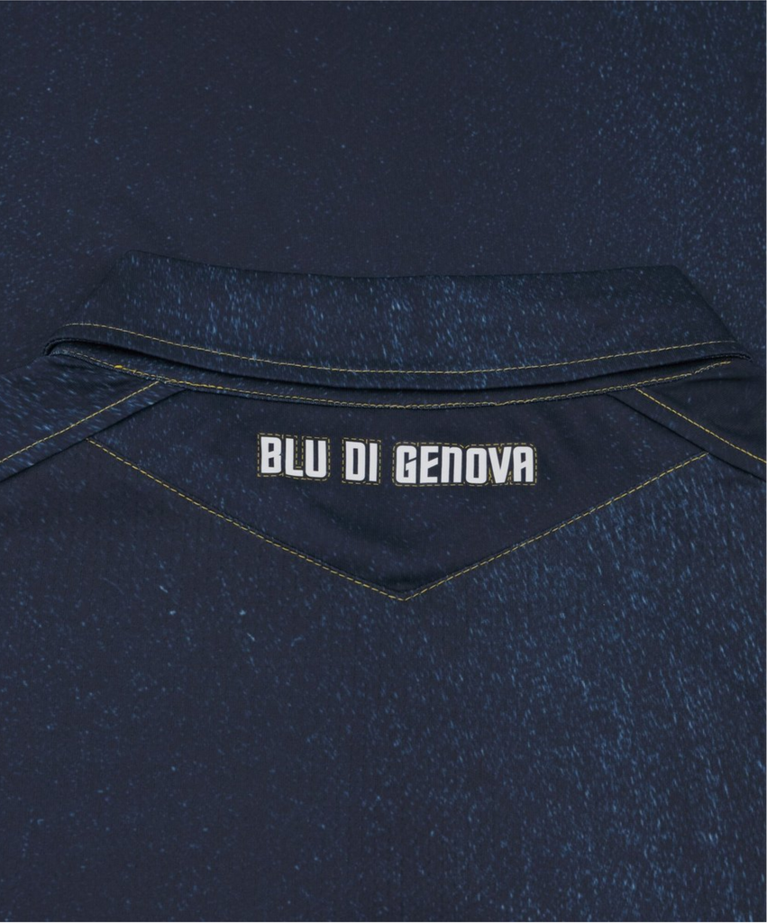 De plaatsing van de logo’s volgt dezelfde opstelling als bij de andere Sampdoria voetbalshirts van dit seizoen. Rechts op de borst staat het witte Macron Hero-logo in siliconenprint, terwijl links een nostalgisch clubembleem uit de jaren zestig prijkt. In het midden bevindt zich het bekende Sint-Joriskruis, symbool van Genua en een teken van trots voor elke Sampdoria-fan. Op de achterkant van de kraag is de tekst “BLU DI GENOVA” verwerkt, een directe verwijzing naar de herkomst van denim. Binnenin de hals bevindt zich bovendien een label in clubkleuren met de logo’s van Sampdoria en Macron, een subtiel detail dat de authenticiteit benadrukt.